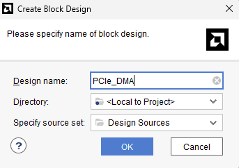 In the “Flow Navigator” panel, select “Create Block Design” under the IP integrator section. Give an appropriate name (Eg: “PCIe_DMA”) to the design and click “OK”.