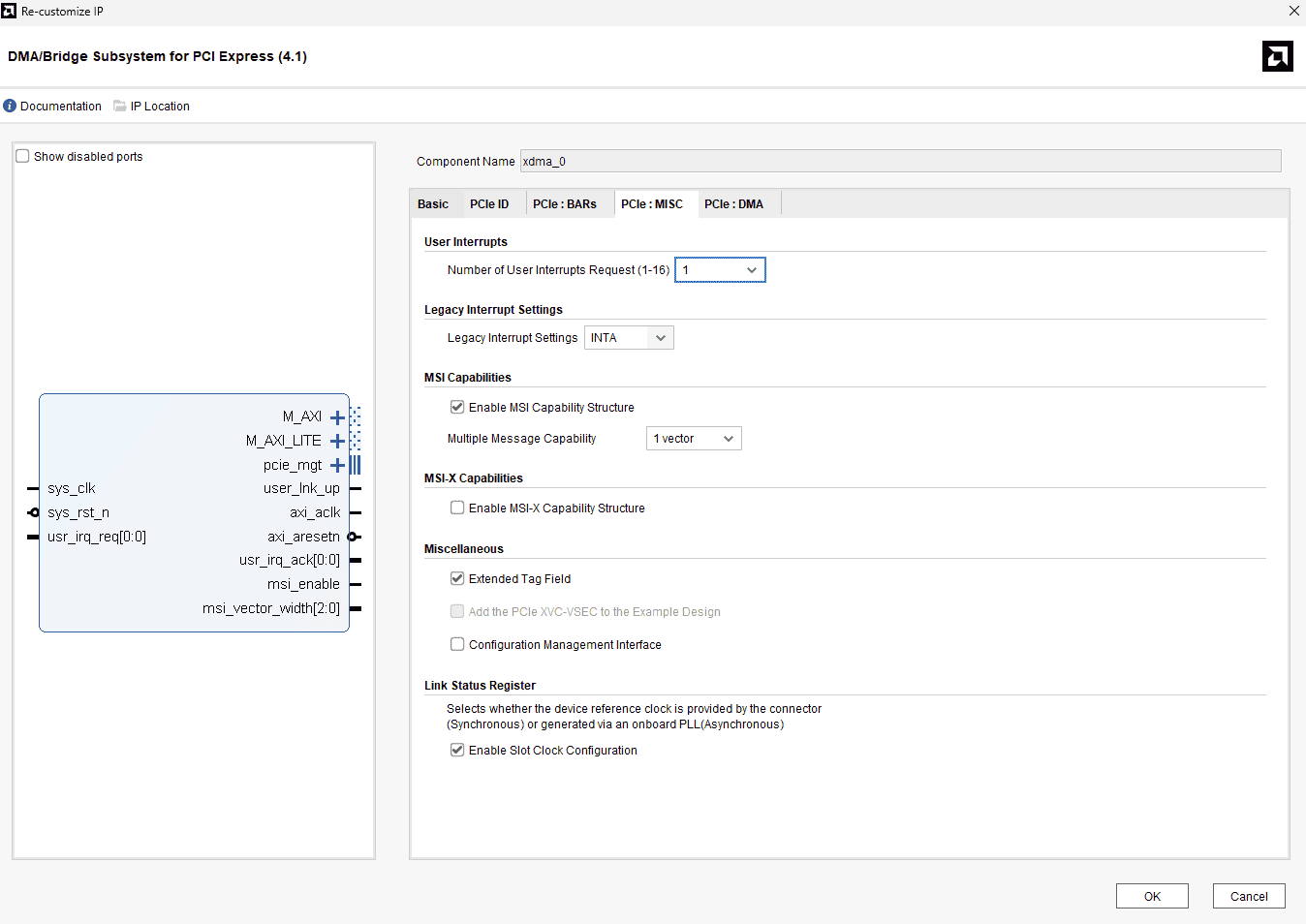 Double click the XDMA (PCIe) IP core to customize it as following