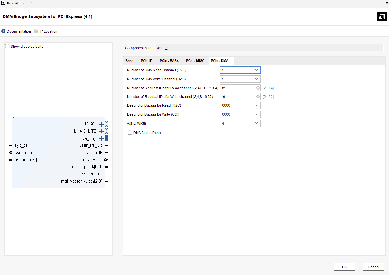 - In the “PCIe: DMA” tab, change the “Number of DMA Read Channels (H2C)” & “Number of DMA Write Channels (C2H)” to 2.