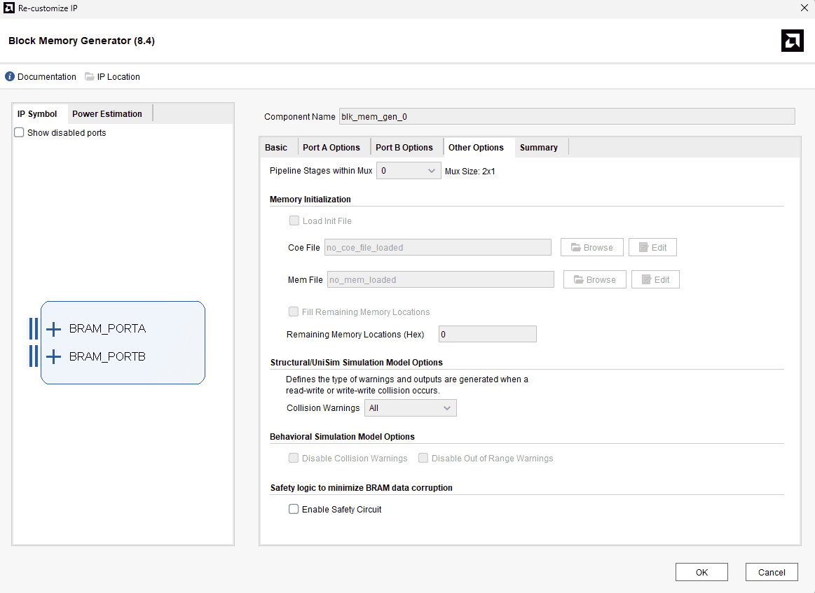 Double click the “Block Memory Generator” IP core to customize it as following.