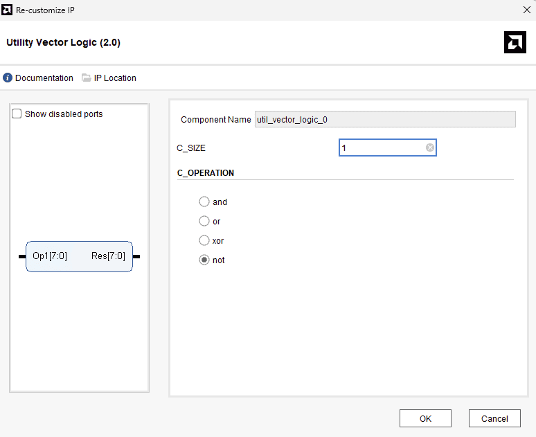 Double click the “Utility Vector Logic” IP core to customize it. Change the “C_OPERATION” to “not” and change the “C_SIZE” to 1 and click “OK” as shown in the image below.