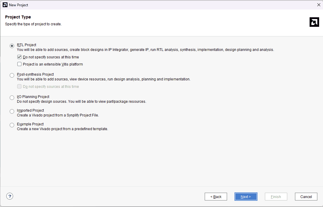 In the “Project type” wizard, select “RTL Project” and select the checkbox to skip specifying the source at the moment. Click “Next”.
