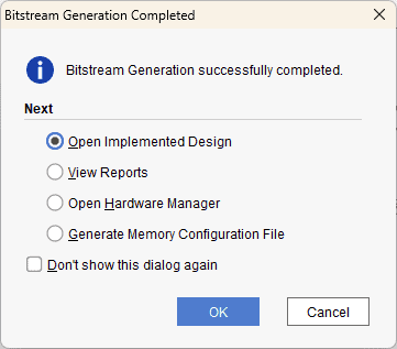 Once the bitstream is successfully generated, close any “Bitstream Generation Completed” dialog which comes up asking for what to do next.