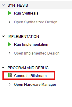 Click “Generate Bitstream” under PROGRAM AND DEBUG section and click “Yes” in any subsequent dialog window which comes up.