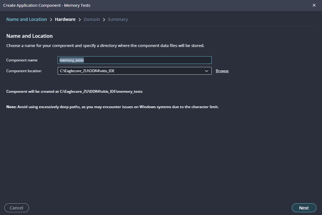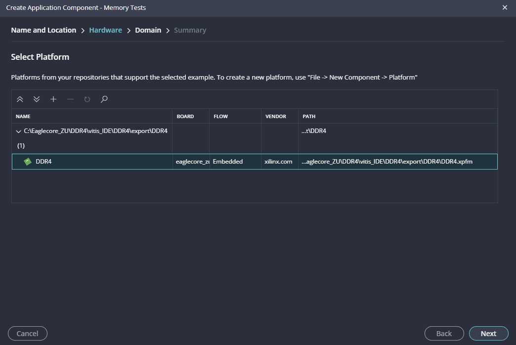 Next create the DDR4_test Application component by selecting the “Memory tests” template from the “examples”,