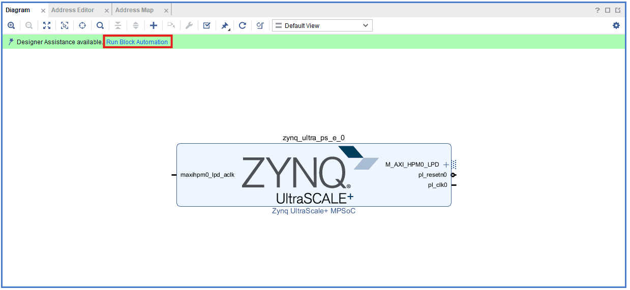 Go to Diagram window, right click and select “Add IP” from the popup menu. Search for Zynq UltraScale+ MPSoC. Add it to block design by double clicking.