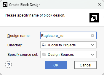Under Flow Navigator, select “Create Block Design” in IP Integrator. Give an appropriate name to design. We will call it “Eaglecore_zu” for example.