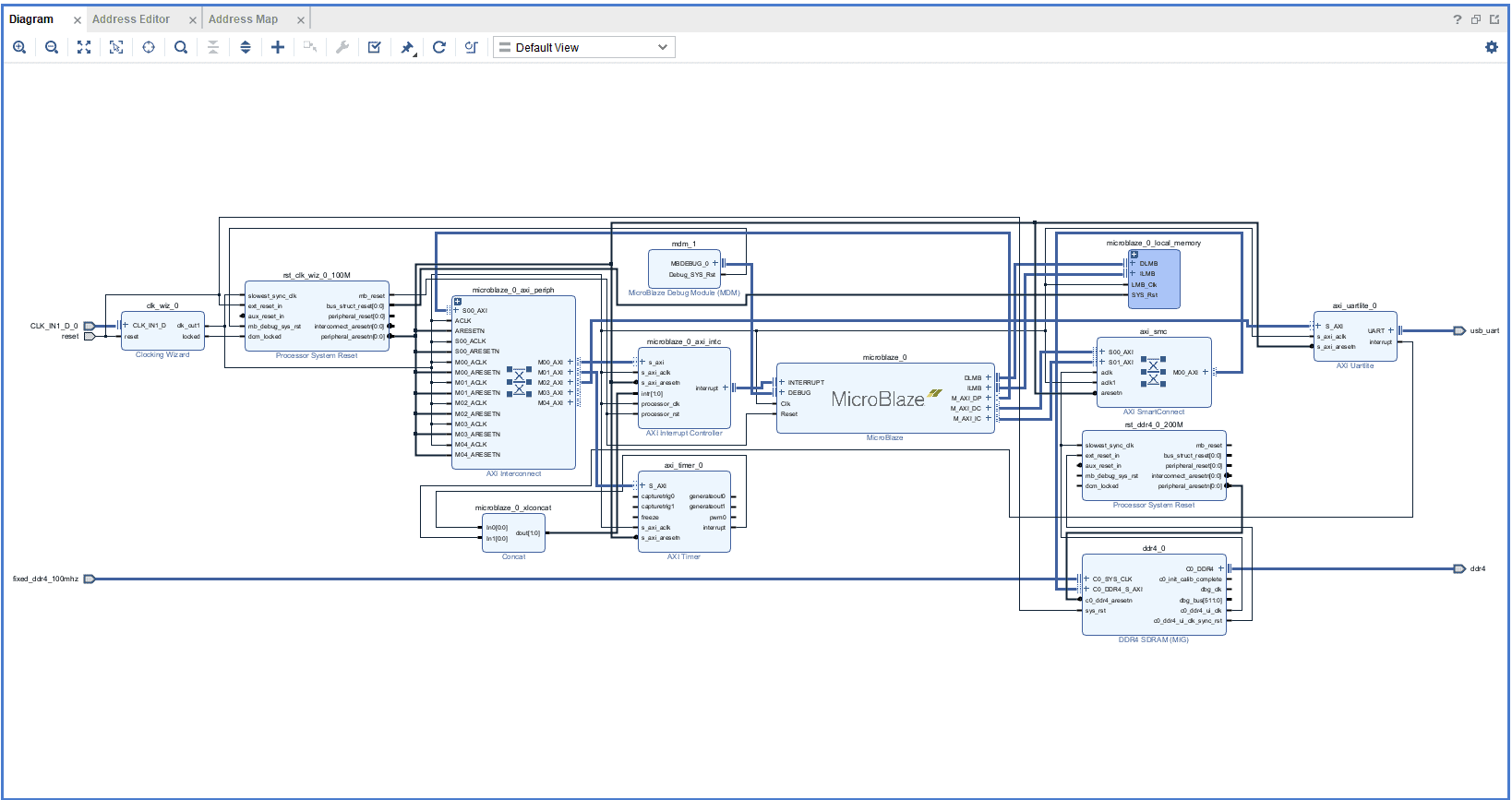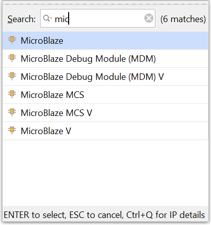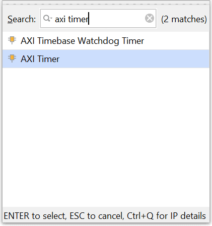 Add DDR4 and USB UART to the design by double-clicking the corresponding peripherals. In the Diagram window, right-click and select “Add IP” from the popup menu. Search for “MicroBlaze” ,”clocking wizard” & “AXI Timer” and add them to the design by double-clicking them.