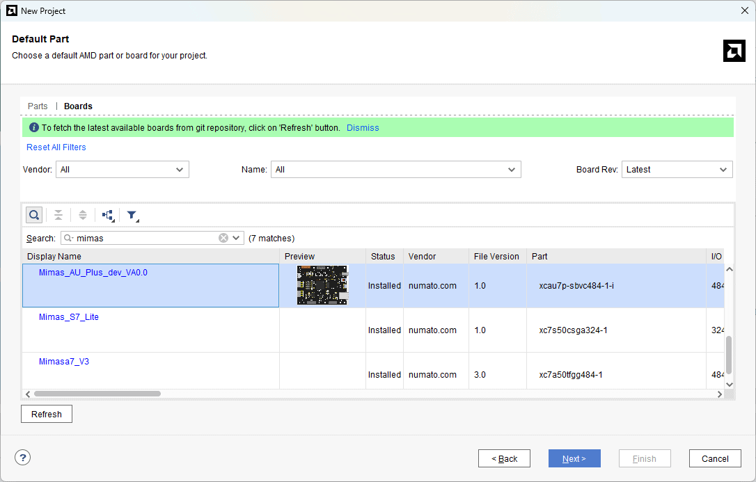 In the Default Part window, select “Mimas_AU_Plus” from the Boards option. If not listed, make sure board support files are installed correctly. Click Next to continue.