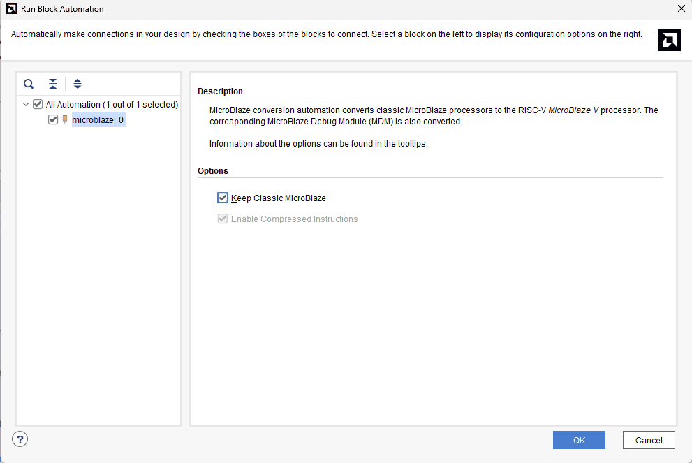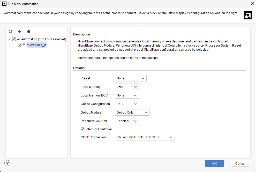 Click “Run Block Automation” present in the “Designer Assistance available” bar on the top left corner of the window to complete the design. Select the settings as shown in the following image. Click “OK” for Vivado to automatically configure the blocks for you. Once Block Automation is complete, run “Connection Automation” so Vivado can connect the blocks to make a complete system.