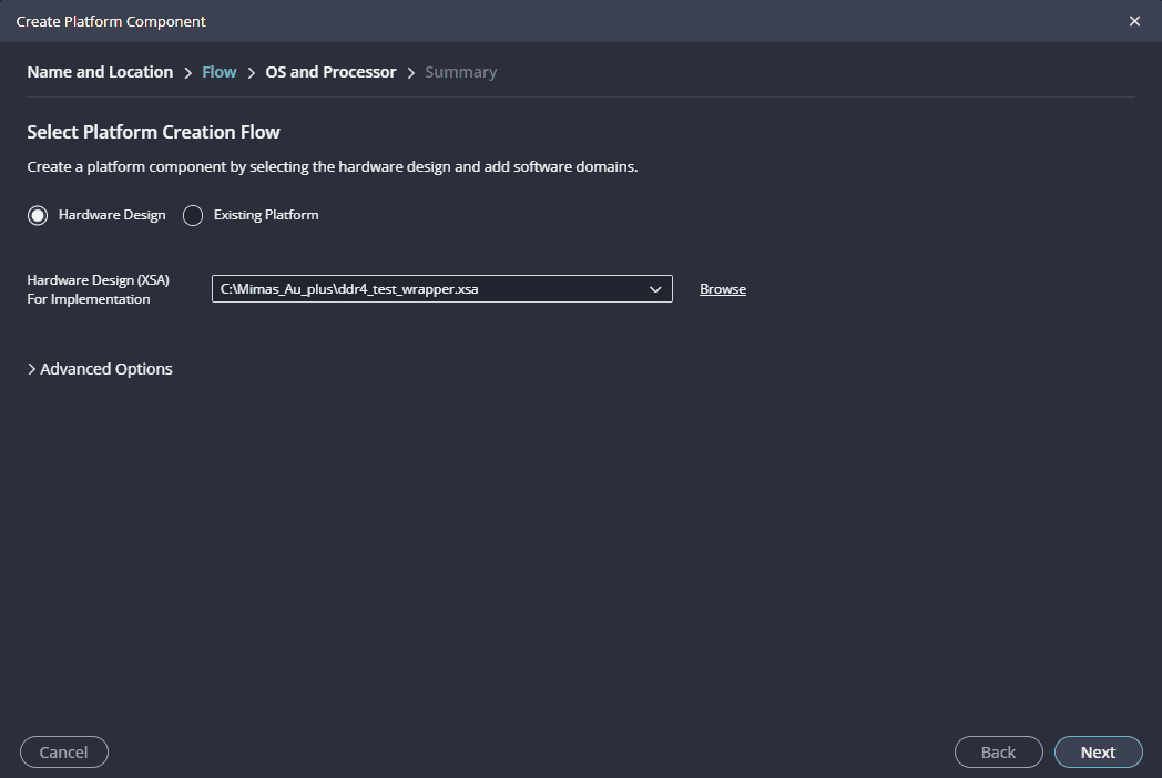 Launch Vitis IDE and create a new platform for the project, by selecting “Create Platform Component”, click “Next”, in the Flow tab select the XSA file saved using the step 15 and finally click “Next” and “Finish” respectively.