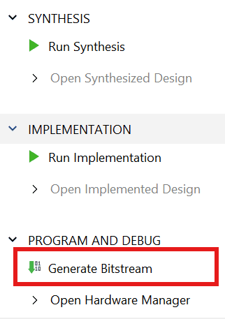 Click “Generate Bitstream” under the “Program And Debug” section to synthesize, implement and generate a bitstream.