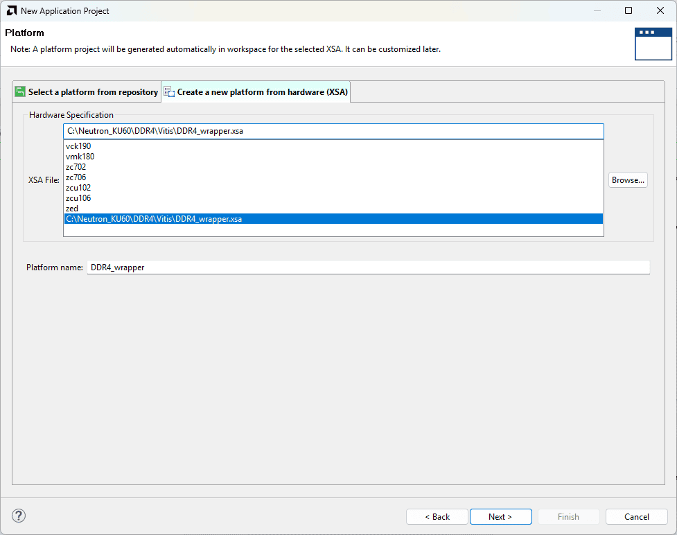 In the Platform window, select Create a new platform from hardware tab and import the XSA file which is already created (Provide XSA file location). Click Next.