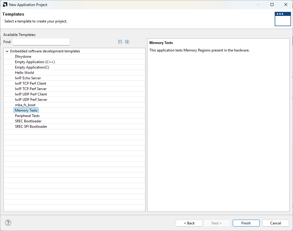 Select the Memory Tests template from the list of available templates and click Finish.