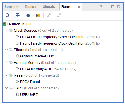 Click the Board tab. The default peripherals available for the Neutron_KU60 will be displayed.