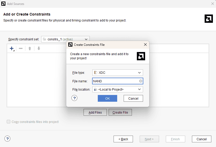 Click on “Create file” and give a name for the XDC and select “File type” as “XDC”. Click “OK” and then “Finish”.