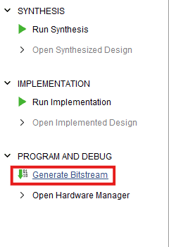 - Once the Bitstream is generated successfully, expand the “Open Hardware Manager” under “PROGRAM AND DEBUG” section of Flow Navigator panel.
