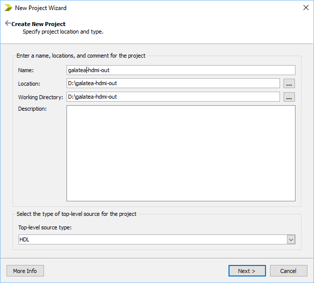 Open Xilinx ISE Design Suite and select “New Project” from “File” menu. The “New Project Wizard” configuration window will open. Select a convenient project location and enter a name for the project. In this article, the author is used “galatea-hdmi-out” as the project name. Click “Next” to proceed.