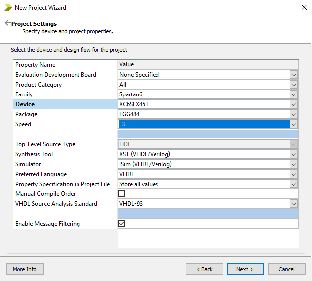 Specify the device and project settings (Family: Spartan 6, Device: XC6SLX45T, Package: FGG484 and Speed: -3) in the “Project Settings” tab as shown below. Click “Next” and “Finish” to create a new ISE project with the selected settings.