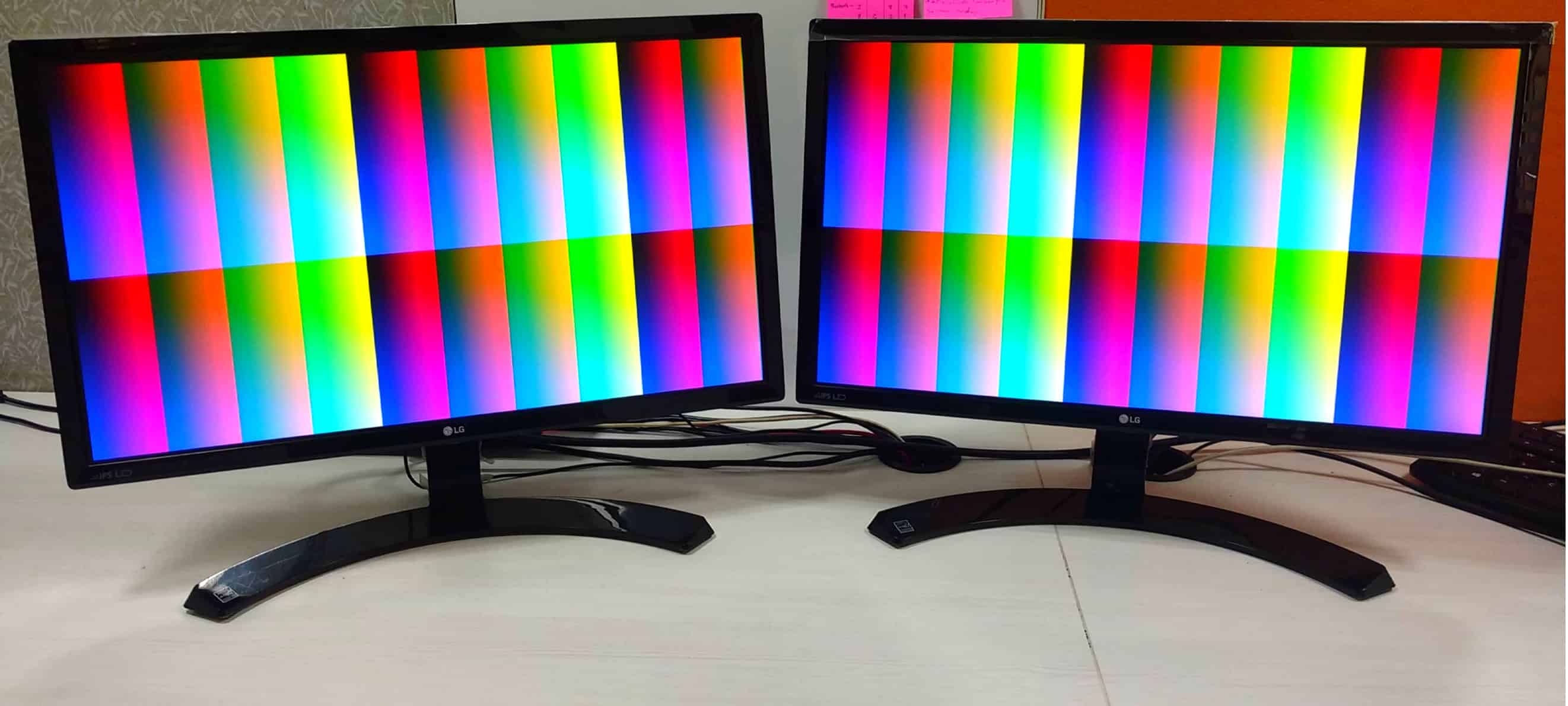 Once the bitstream is generated successfully, connect the Galatea IP4776CZ38 HDMI expansion module to header P4 of Galatea PCI Express Spartan 6 FPGA Development Board and connect two HDMI cables from HDMI expansion module to the two HDMI-capable monitors. Power up the Galatea board and program the generated bit file. Once the bitstream is programmed, both the monitors should display a color pattern at 640×480@60Hz resolution as shown below.