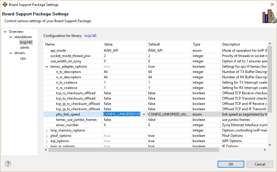 Open ‘lwip140’ library configuration window, under ‘temac_adapter_options’ select phy_link_speed as ‘CONFIG_LINKSPEED100’.
