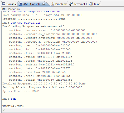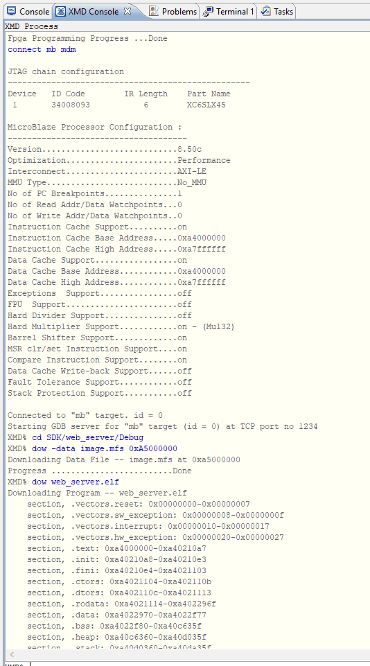connect mb mdm cd SDK/web_server/Debug dow -data image.mfs 0xA5000000 dow web_server.elf con