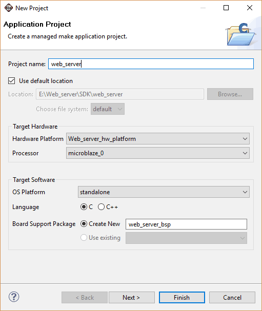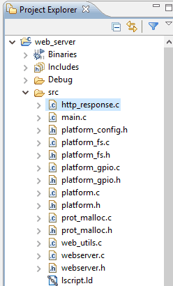 Download the source code for this project from here. Go to web_server -> src, remove all files except ‘lscript.ld’ and and add the downloaded source files to the project.