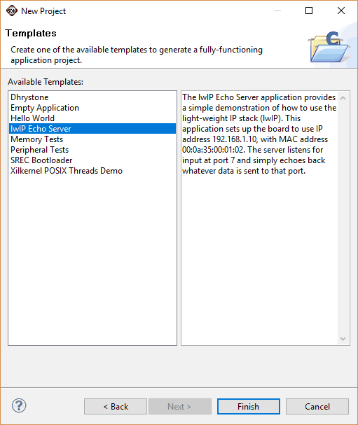 Enter project name as ‘web_server’ and click ‘Next’. It will open ‘Templates’ page. Select ‘lwIP Echo Server’ as template and click ‘Finish’.