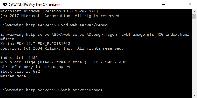 Once the design is ready, MFS (Memory File System) image needs to be written to memory for testing the web server. The MFS image contains the index.html file which is opened and read when the web server receives GET command i.e. when a client requests a web page.