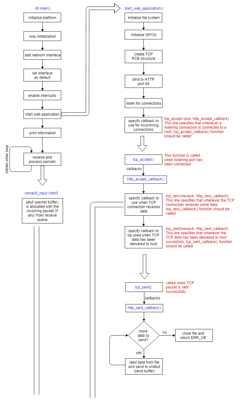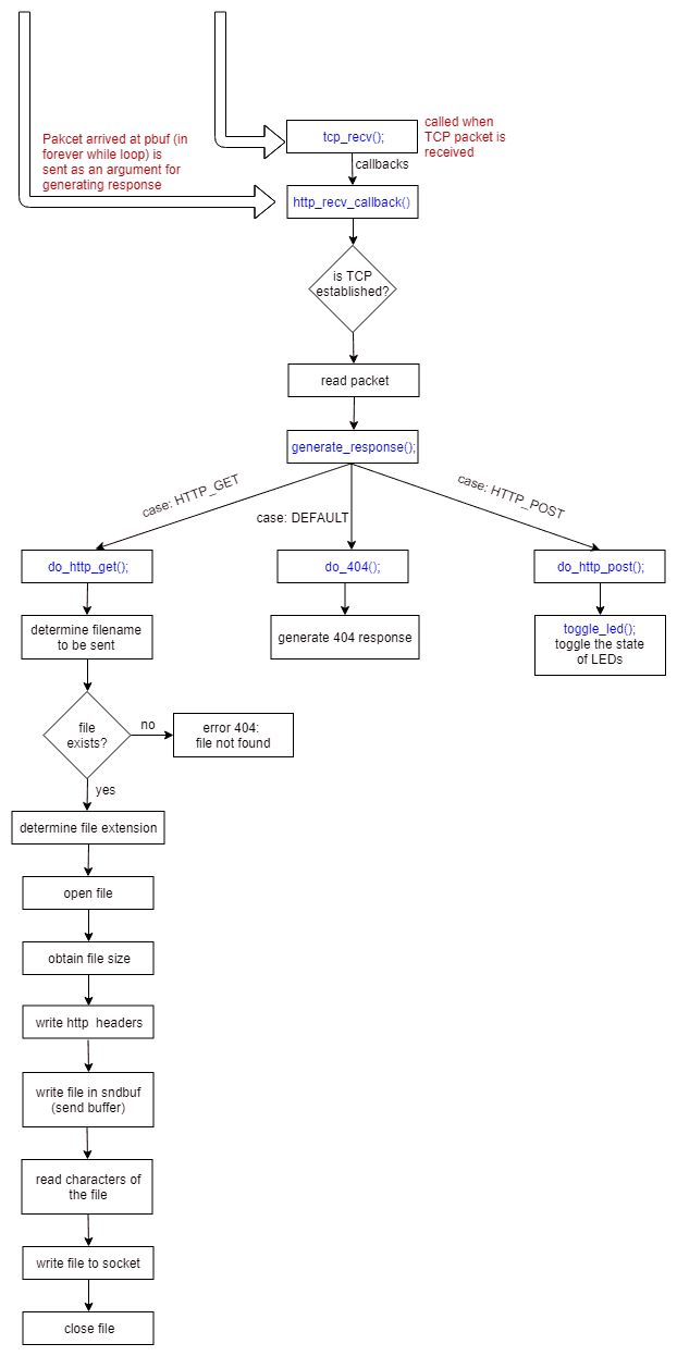 http_accept_callback: This function is called bytcp_accept(), which is called when the listening connection changes to established state, i.e, client is now connected.http_recv_callback: This function is called bytcp_recv(), which is called whenever any TCP packet is received. Thepbufis passed tohttp_recv_callback(), the data is parsed as per HTTP protocol specification and response is generated accordingly.http_sent_callback: This function is called bytcp_sent(), which is called when a TCP packet has been sent successfully, it will check if there is any more data to be sent and sends the remaining data (if any).