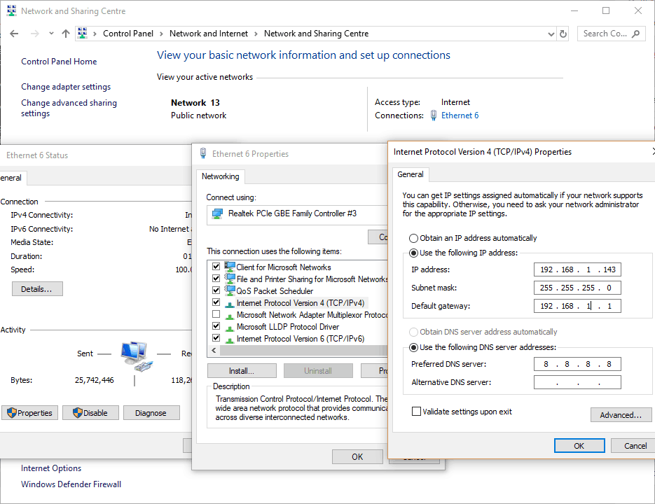 In Windows, go to Control Panel -> Network and Internet -> Network and Sharing Centre. Double-click on ‘Ethernet’ adapter, click on ‘Properties’, select IPv4 properties and change the IP address, Subnet mask and Default gateway as shown below. If you use any other host operating system, configure the network interface as applicable.