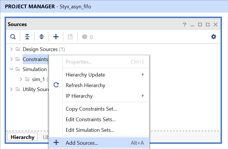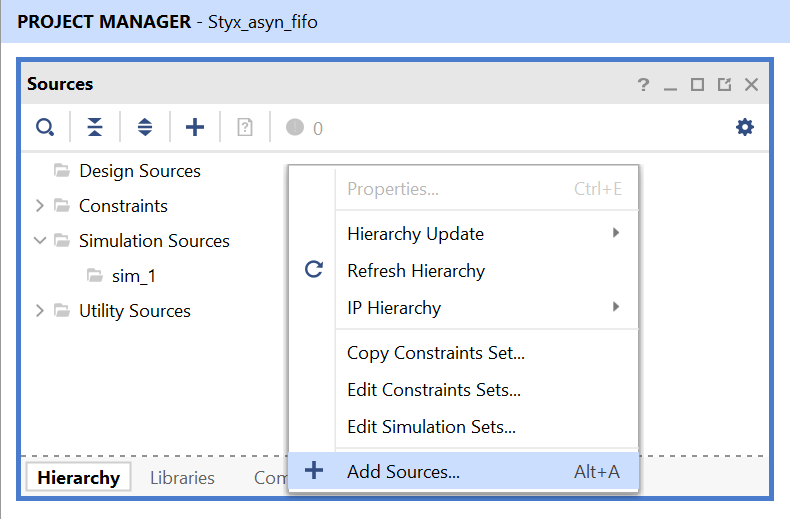 Right-Click on ‘Design Sources’ and select ‘Add Sources’. It will open a configuration window for adding Verilog files.