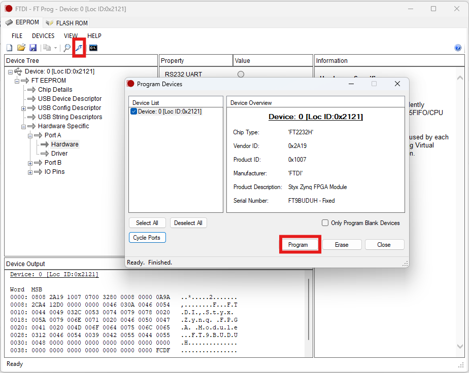 - FT_Prog tool for configuring on-board FT2232H USB Serial converter (download and install from FTDI website)
