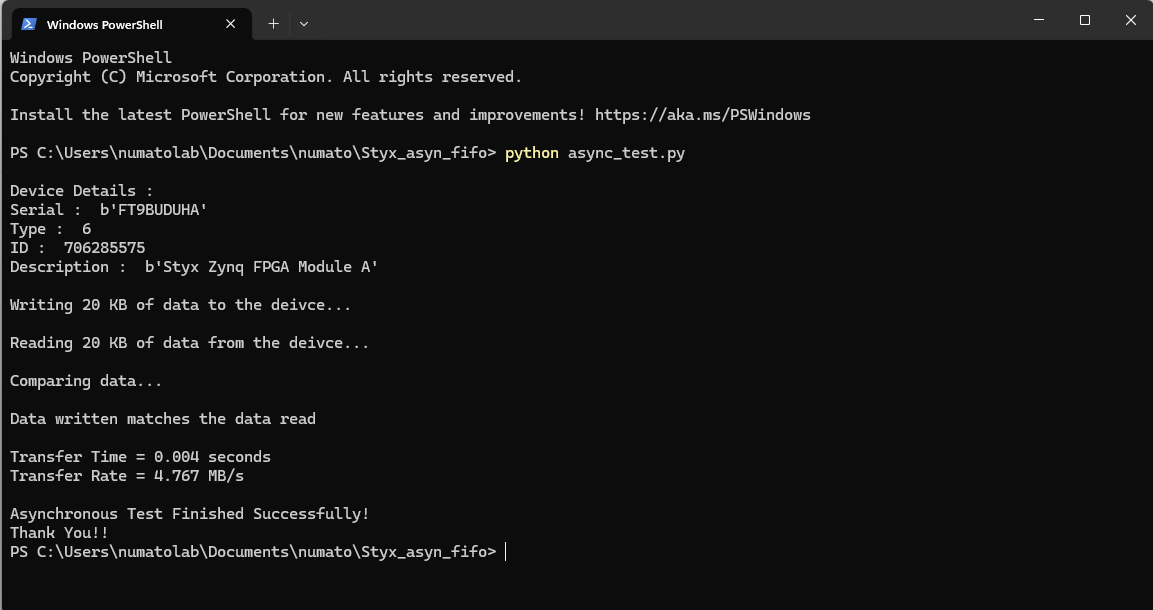The FTDI FT2232H USB 2.0 chip on-board Styx provides users with a FIFO interface for data transfer between FPGA and host PC. The FT2232H chip features two channels or ports, which can be configured into various modes like UART, FIFO, JTAG etc. On Styx, Channel B is used for FPGA configuration and flash programming, whereas channel A is for custom usage. This article demonstrates communication between host and the board using Asynchronous FIFO mode via boards’ respective channels of FT2232H. The Channel A of FT2232H in case of Styx , when configured as FIFO, acts as a USB-FIFO bridge between host and FPGA.