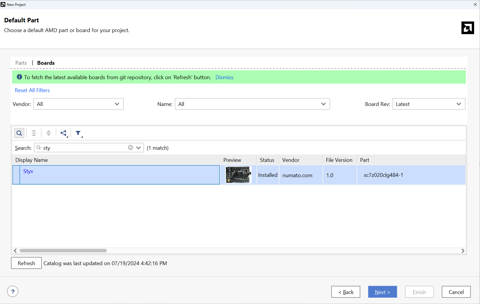 At the “Default Part” step, select “Boards” and choose Vendor as “numato.com”. Select “Styx” and click “Next”. If Styx is not displayed in the boards list, you will need to install Styx board support files correctly.