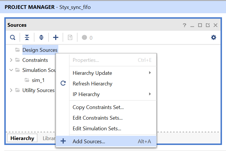 Right-Click on ‘Design Sources’ and select ‘Add Sources’. It will open a configuration window for adding Verilog files.