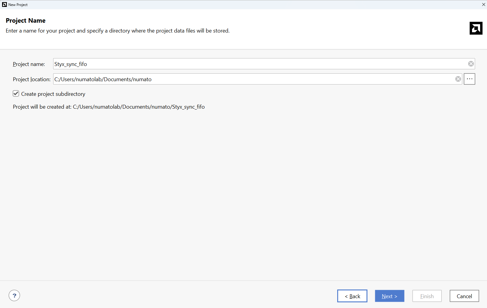 Type in a project name and save it at a convenient location. For this example “Styx_sync_fifo” is used as project name, but feel free to use any name. Select the check box below to keep all project files in a single folder. The image below shows the settings for the example project. Click “Next” to continue.