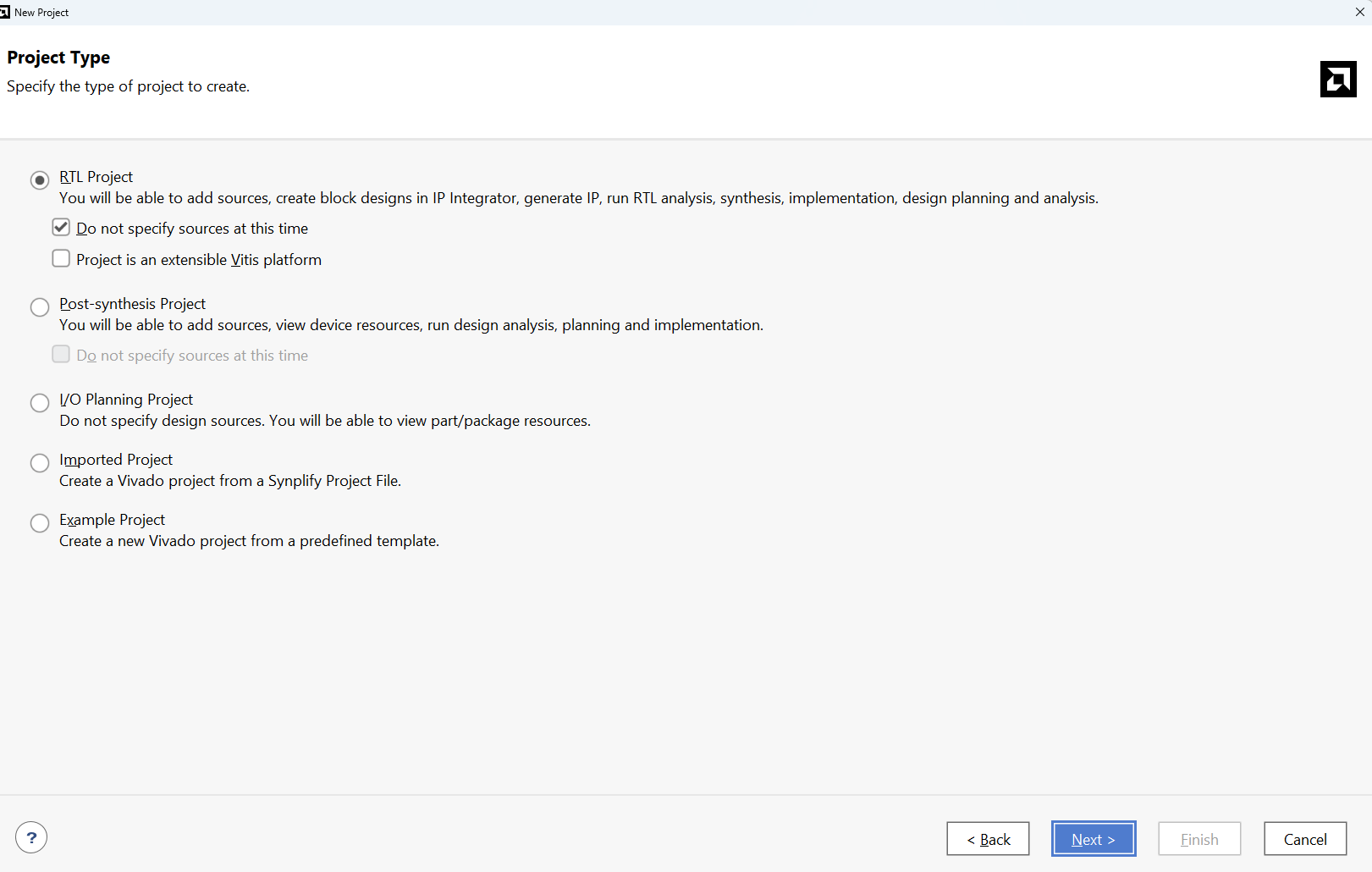 Choose “RTL Project” as project type and check the option “Do not specify sources at this time”