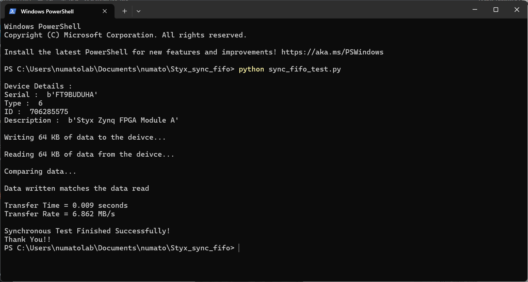 The FTDI FT2232H USB 2.0 chip available on-board Styx provides users with a FIFO interface for data transfer between FPGA and host PC. The FT2232H chip features two channels or ports, which can be configured into various modes like UART, FIFO, JTAG, etc. On Styx, channel B is used for FPGA configuration and flash programming whereas Channel A is available for custom usage. This article demonstrates communication between the host and the board using Synchronous FIFO mode via channel A of FT2232H. The Channel A of FT2232H, when configured as FIFO, acts as a USB-FIFO bridge between host and FPGA. Synchronization is done using the 60 MHz clock available on FT2232H. Let’s get started!