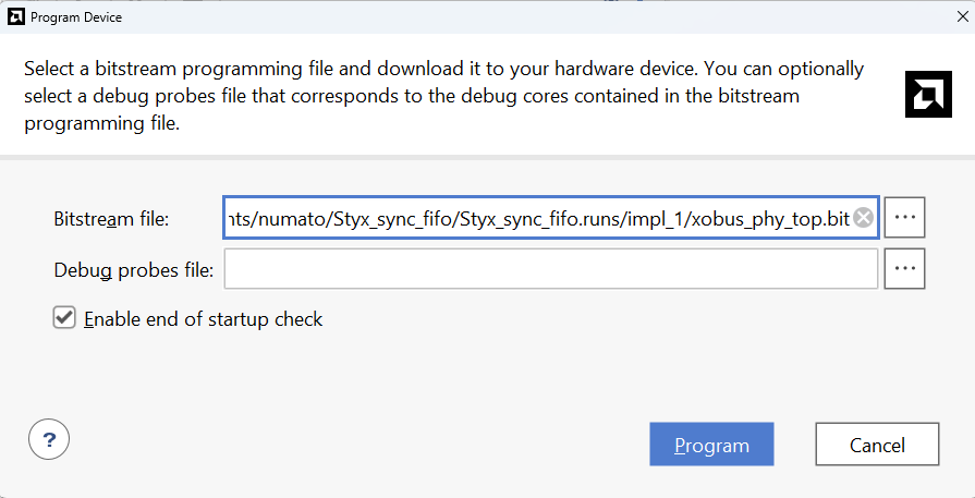 Dialog window for programming will open. Program the bit file by clicking ‘Program’.