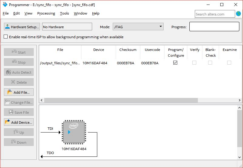 The Programmer window will open. Click “Start” and wait for the device to get programmed. Make sure you have connected Telesto with USB Blaster and powered up before attempting to program it. You might need to go to “Hardware Setup…” to choose your JTAG hardware. Click ‘Start’ to program.