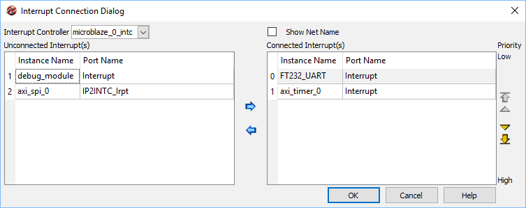 In the interrupt control dialog box, make sure that both  FT232_UART and axi_timer_0 are connected to the interrupt controller and debug_module and axi_spi_0 are not connected to the interrupt controller as shown in the image below.