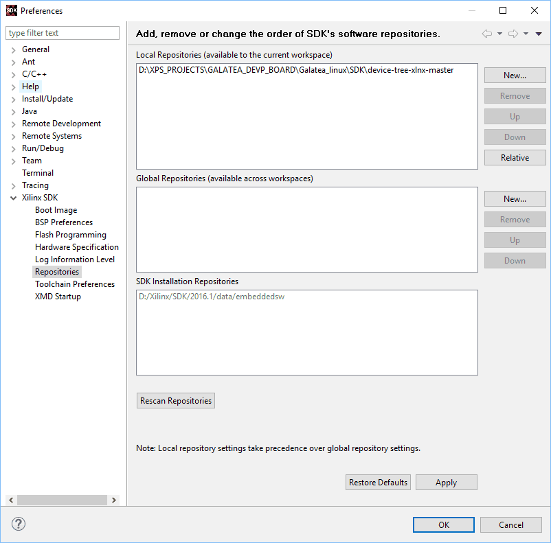 Step 3: In the Dialog window, we have a section named “Local Repositories”.  Select “New” and select the device tree folder which you had downloaded and extracted to SDK workspace. Final result should look like in the below image.