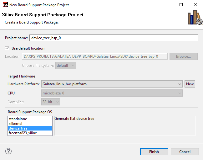 Step 4: Go to File -> New -> Board Support Package. In the Dialog window, select “device_tree” under “Board Support Package OS” and press “Finish” and then “OK” in another dialog that opens.