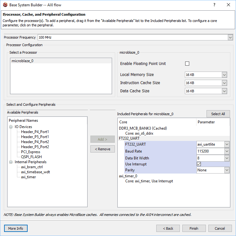 By default, FT232_UARTand DDR3_MCB_BANK3 will be selected. Select memory size, I-cache size and D-cache size as 16KB. Then select FT232_UART peripheral and set the baud rate to 115200 and check the “Use Interrupt” check box. Then select “axi_timer” in the “Available Peripherals” list and add that to the system. Select the timer and check the “Use Interrupt” check box. Make sure everything is setup as shown in the image below and click “Finish” button.
