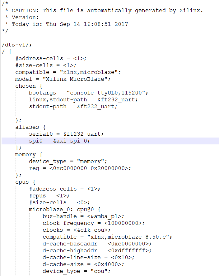Step 5: We have to merge the ‘.dtsi’ and ‘.dts’ files. So open both of them in some text editor (Notepad++ etc) and copy the contents of system.dts and paste them in the .dtsi file just after the line ” model = “Xilinx MicroBlaze” .  Don’t forget to add “/dts-v1/;” at the top of .dtsi file also. The final content should look like this