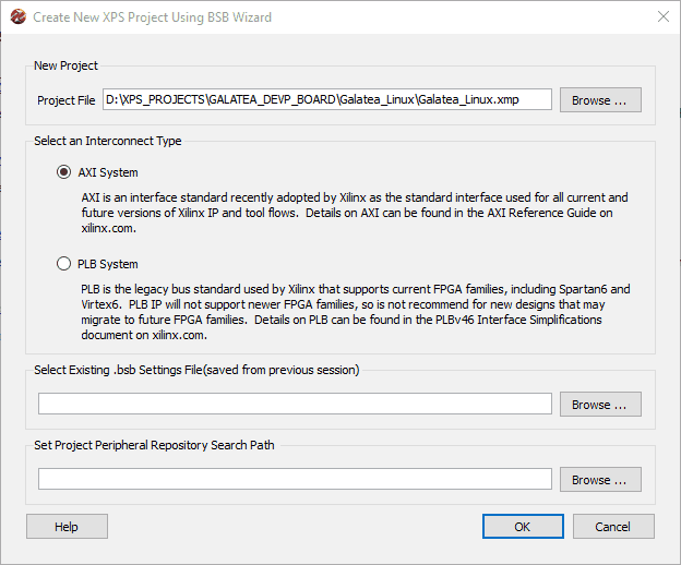 For this section we are building Microblaze based embedded platform for Linux using Xilinx EDK. Now let’s get started. We will need to use XPS Base System Builder (BSB) to create a new project. To make the process easier, download BSB Wizard files from here and copy to the folder “C:\Xilinx\xx.xx\ISE_DS\EDK\board”. Once extracted, the complete path to the file should look like C:\Xilinx\xx.xx\ISE_DS\EDK\board\NumatoLab\ipxact\GalateaPCIeDevBoardLX45T_V1\data”. Now go to All Programs > Xilinx Design Tools > EDK and start Xilinx Platform Studio. Once XPS is loaded, click on “New BSB Project” under File menu or press Ctrl + Shift + B to invoke the BSB wizard. If everything went fine, you should be presented with BSB wizard window as shown below.