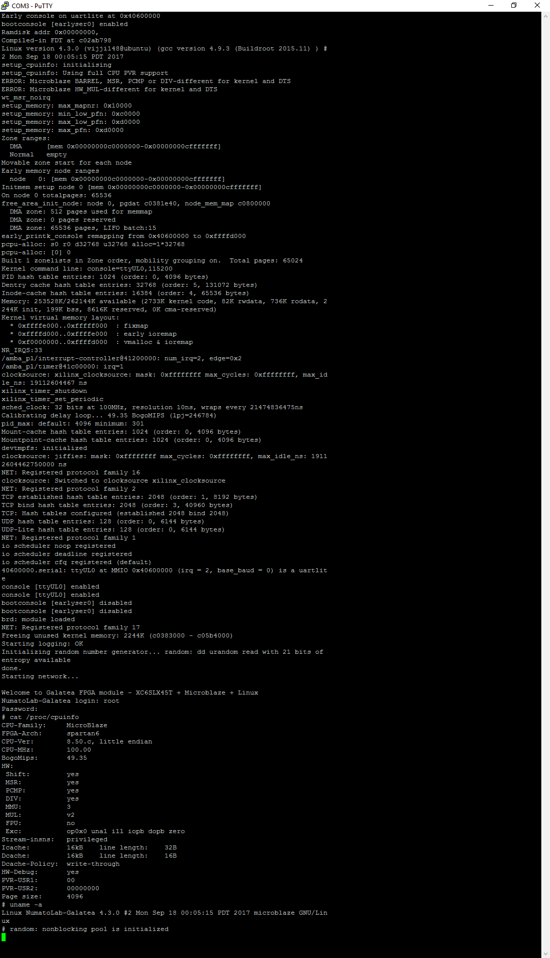 You can login to Linux with username “root” and password as “galatea”. We have a successfully running Linux kernel in Galatea PCI Express Spartan6 FPGA Board! Congratulations!  Those who could not successfully boot, please don’t give up and keep trying. You should be able to tackle this without much difficulties.
