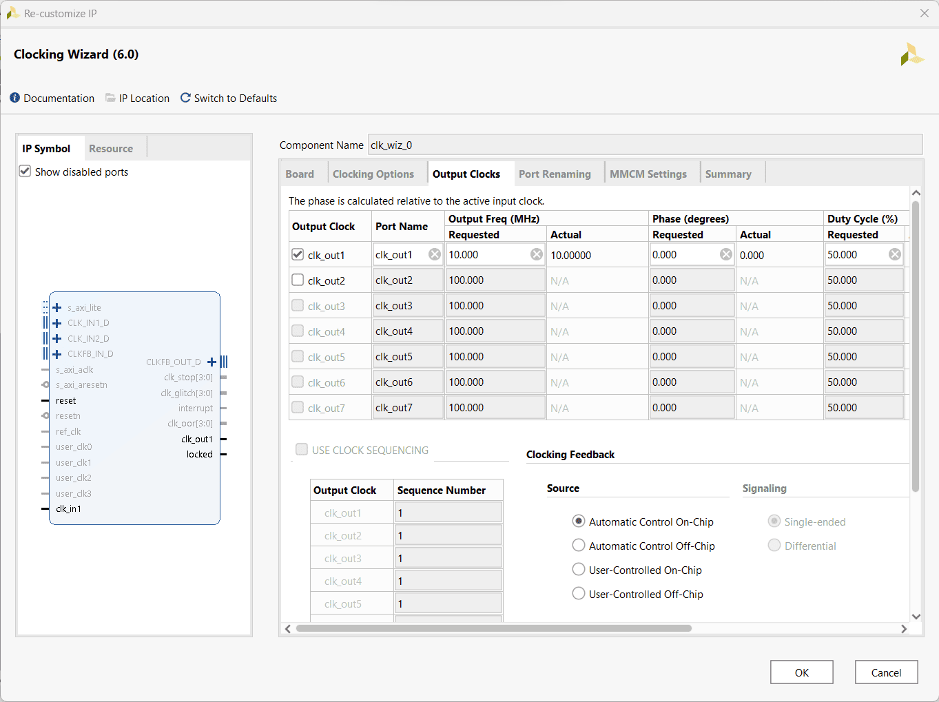 In Output Clocks tab, Provide clk_out1 value as 10MHz and Click OK.