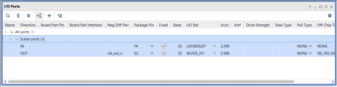 set_property PACKAGE_PIN F4 [get_ports clk] set_property IOSTANDARD LVCMOS25 [get_ports clk] set_property PACKAGE_PIN E2 [get_ports clk_out_p] set_property IOSTANDARD BLVDS_25 [get_ports clk_out_p]